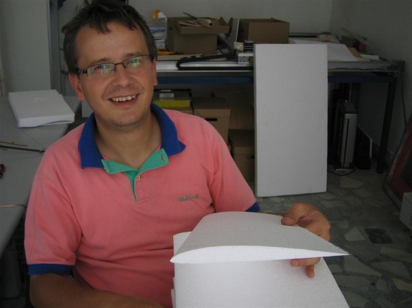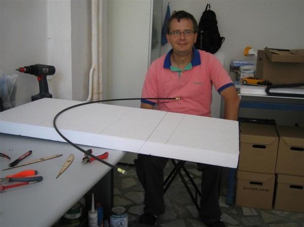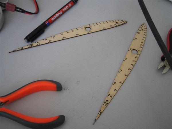 Köpük kanatları kesmek için, önce şablonları kontraplak veya metalden kesiyoruz ve üzerine belirli aralıklarla numaralar koyuyoruz, böylece iki kişi köpüğün iki ucunda teli gerip kesim yaparken “ben şimdi 13 numaraya gidiyorum” diyerek paralel kesim yapılmasını sağlıyoruz.