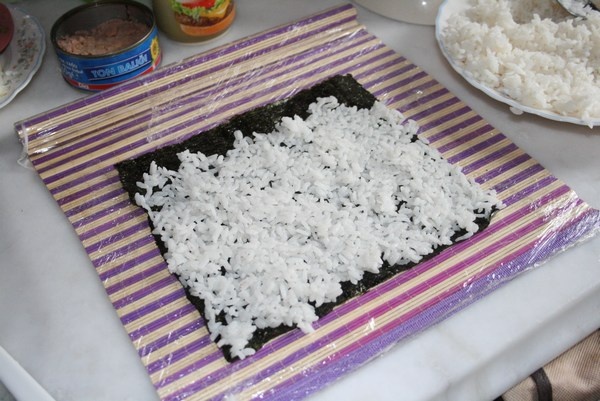 Burada pirincin miktarı ve norinin boyu sushinin çapını belirliyor, ben doyurucu olan büyük boy yapmayı seviyorum, hem içine daha çok malzeme sığıyor.