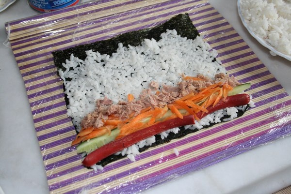 Amerikan servis vasıtası ile sushimizi yavaşca kıvıryor, tam rulo olduktan sonra üstüne kuvvetlice bastırarak pirinçleri iyice sıkıştırıyoruz.