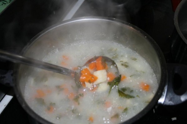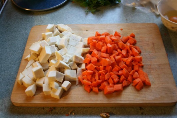 Kerevizi, ve havucu küp küp doğruyoruz. Maydonozu da yaprak yaprak ayırıp(veya iri parçalara bölüp) bir miktar tuz ile beraber tencereye koyuyor kaynatıyoruz.