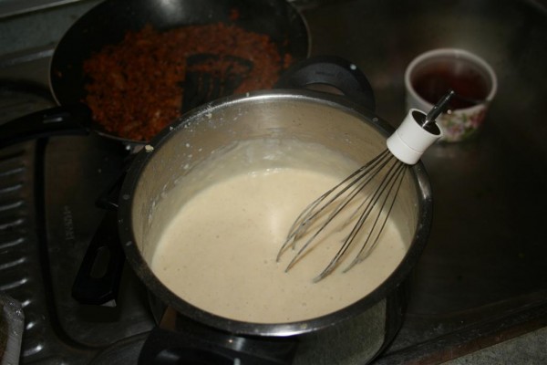 Üstüne kalan makarnayı koyup beşamel sosu boca ediyoruz.  sosu her tarafına düzgünce yayıyoruz.